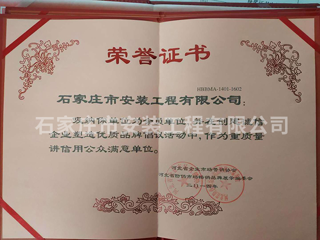 重質(zhì)量講信用公眾滿意單位榮譽(yù)證書